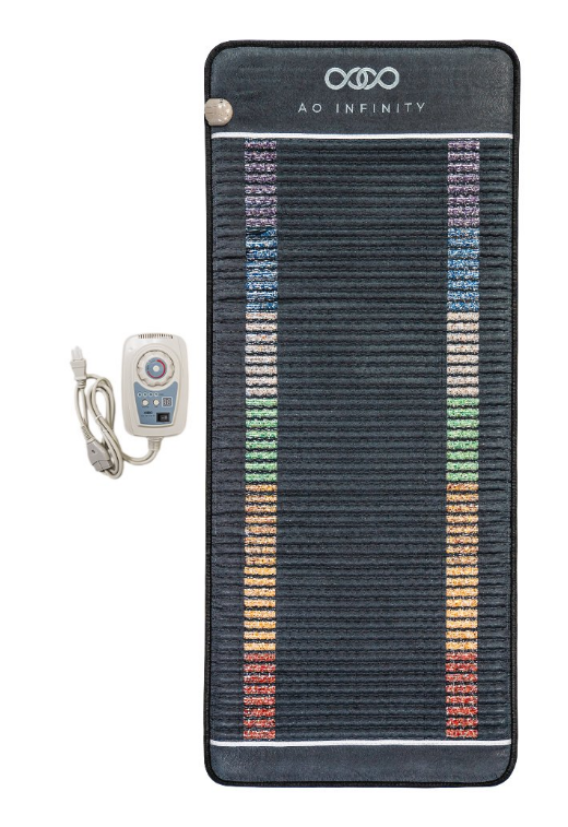 The AO Infinity Mat is a low-intensity PEMF mat that emits infrared heat, uses natural chakra stones, and has a unique coil design to help reduce stress, increase energy, improve sleep, and circulation.